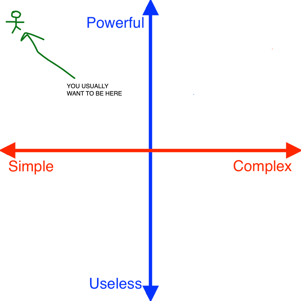 In Fig. 2, if x is still the simple-complexity scale, and y is still powerful-useless scale, then, like 70%-80% of the time, you should stop optimizing for simplicity and powerfulness at the local maximum. That's the sweet spot.